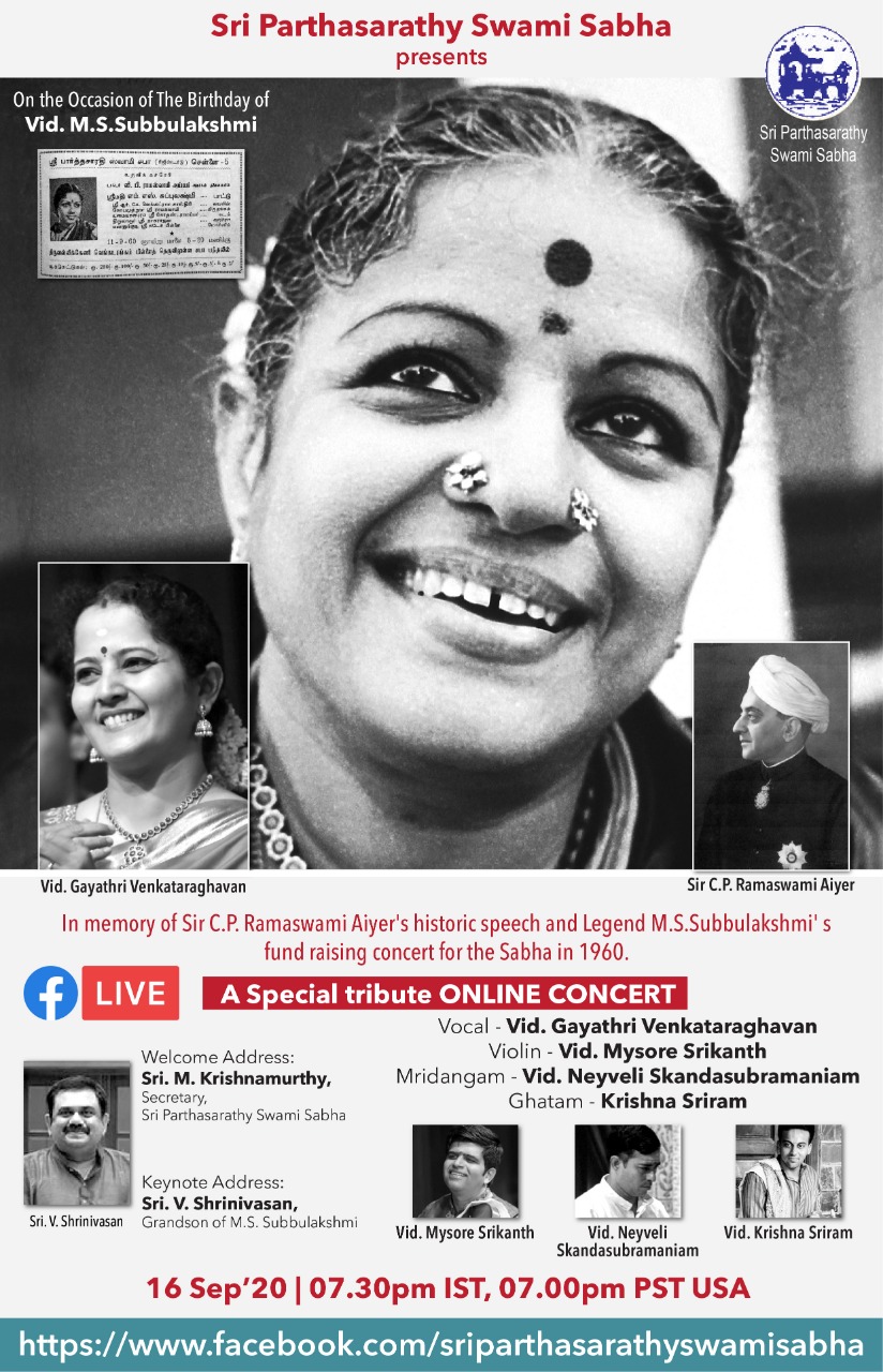 The sabha presented a Tribute to Vid. M.S.Subbulakshmi on the occasion of her birthday and in memory of Sir C.P Ramaswamy Aiyer’s historic speech and Legend M.S.Subbulakshmi’s fund raising concert for the sabha in 1960 on 16th Sep 2020