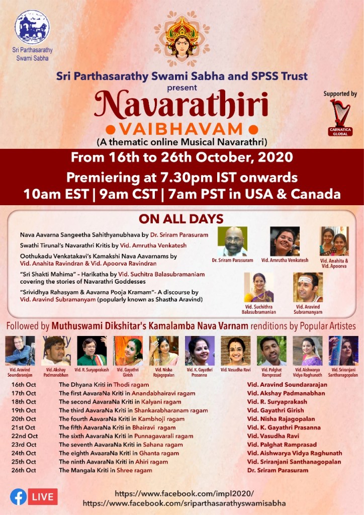 Sri Parthasarathy Swami Sabha and SPSS Trust presented Navarathri Vaibhavam – A thematic online musical Navarathri from 16th to 26th October 2020.