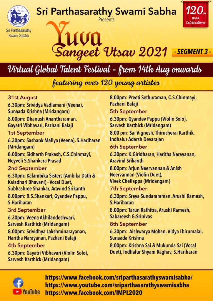 We thank all the gurus, parents and all the participants for their support for Yuva Sangeet Utsav 2021. We have had overwhelming response from all over the world for both Vocal and Instrumental category with 300 and more entries. Earlier circulars were sent inviting participants to register their participation by sending an Audio/Video recording of a Kriti with Ragam, Niraval, Swaram not exceeding 20 minutes. Many participants have done very well as mentioned by the judges in their comments. It became a very tough process in selecting the candidates to participate in the festival.