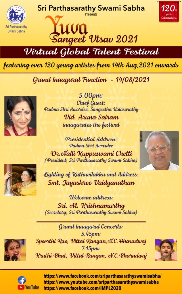 Apart from vocal rare instruments like Navtar, is introduced, apart from Traditional Veena, Violin. The virtual festival, long event featuring talents from different parts of the world will be to almost for 60 days which will be Inaugurated on 14th August 2021. Smt. Aruna Sairam has consented to inaugurate the festival. The enthusiasm of participants shows Carnatic music very much safe in the hands of youth world wide and will continue to be more popular in the future.