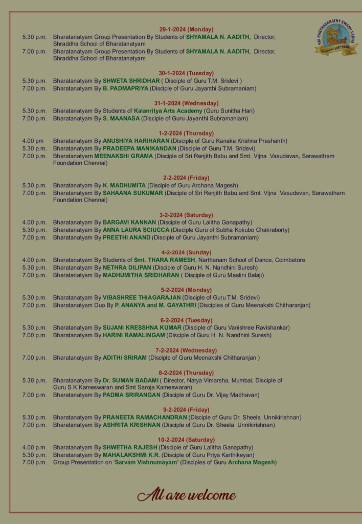 Sri Parthasarathy Swami Sabha celebrates classical dance forms through our Bharat Nditya Utsav at RK Swamy Auditorium from January through March 2024. The schedule is given below for the Pre festival and the festival.
