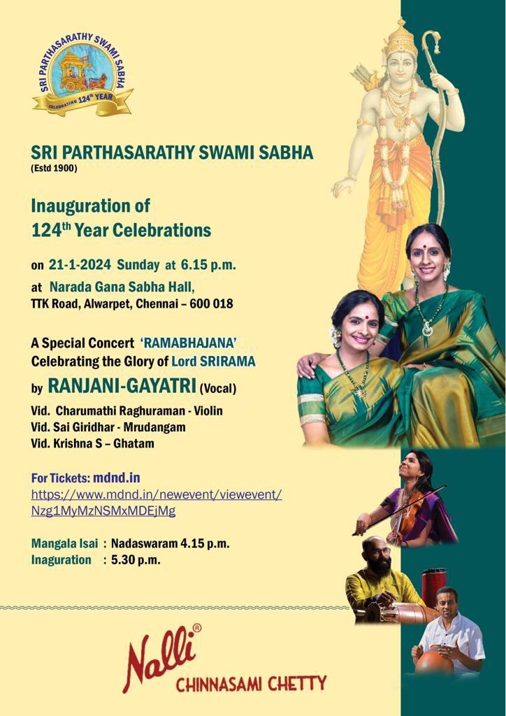 Sri Parthasarathy Swami Sabha inaugurates 124th Year celebrations with a special concert ‘Ramabhajana‘ celebrating the glory of Lord Sri Rama by Ranjani- Gayatri on 21st January 2024 at 6.15 PM at Narada Gana Sabha Hall, TTK Road, Chennai – Tickets available – click here
