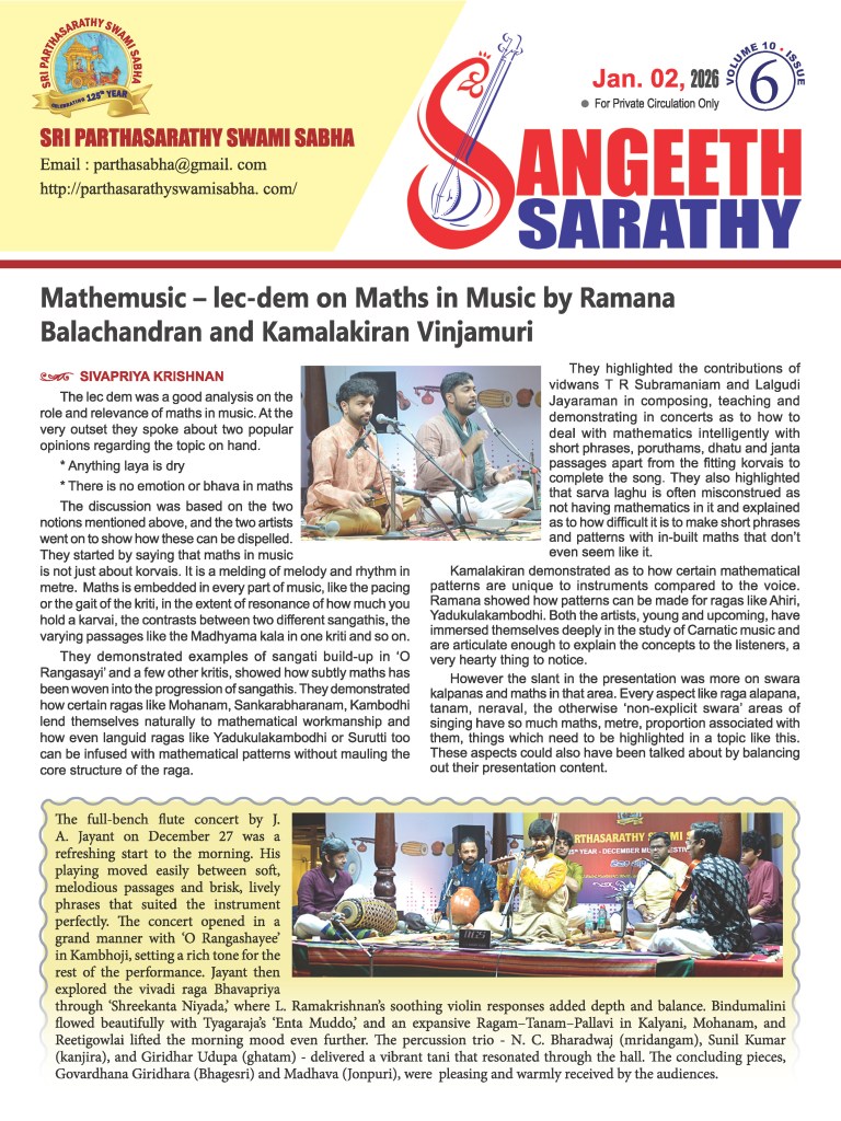 Sangeeth Sarathy Issues of the Isai Vizha 2025-2026. The sabha’s annual magazine Sangeeth Sarathy is more than just a publication; it’s a record of performances that shape the music season. Every page captures the artistry, passion, and cultural depth the sabha shares with its audience. Thanks to the Sangeeth Sarathy Team for making it happen.
