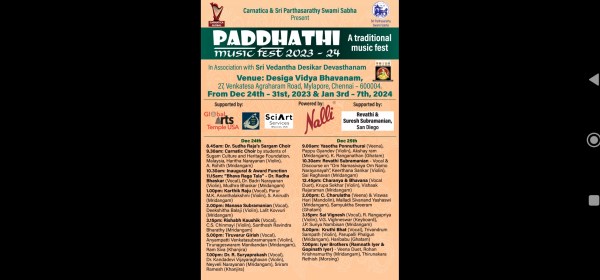 Sri Parthasarathy Swami Sabha and Carnatica present Paddhathi Music Fest 2023-2024 from Dec 24th-31st 2023 and Jan 3rd-7th 2024 at Desika Vidya Bhavanam, Mylapore. Details